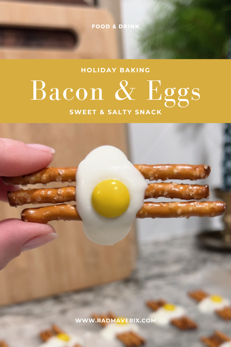 Every year during the holidays, we would make this sweet and salty snack called bacon & eggs. You need three ingredients and less than an hour to put this treat together, which makes it perfect for last-minute classroom treats or office potlucks.