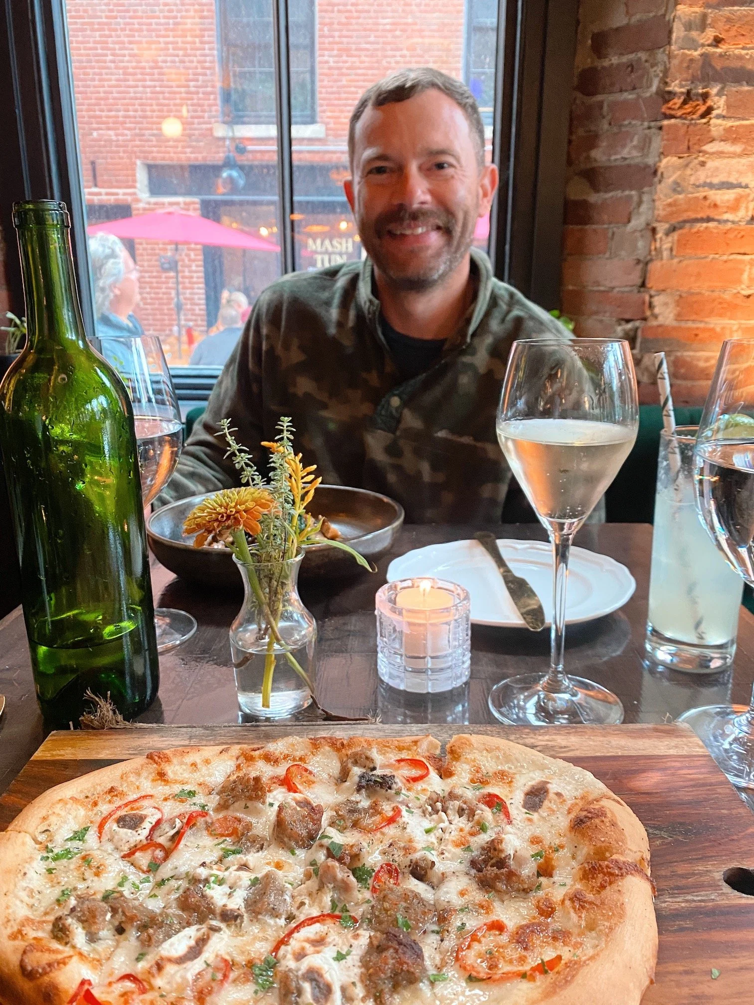 Saturday evening, we simply walked around, relaxed, shopped a little, and had an early dinner at ViA VECCHiA. Even if you only stop for a drink, this restaurant is beautiful with its ornate and speakeasy decor. The service was excellent, and the atmosphere was dreamy. For dinner, we shared the short rib ravioli and the central street pizza. Iβm not typically ordering pizza out at restaurants. However, our waiter recommended it. I was also intrigued because it consisted of whipped ricotta cheese as the βsauceβ instead of marinaraβ¦so I had to try it. The pizza did not disappoint!